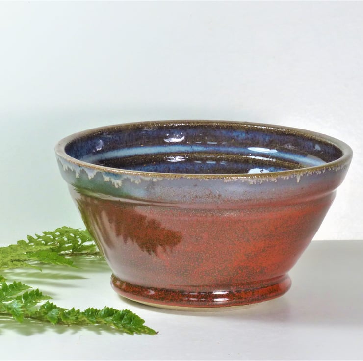 The colours in this bowl include on the inside a rich mixture of blues and mauves, the rim an olive green, and the outside a russet and reddy brown.