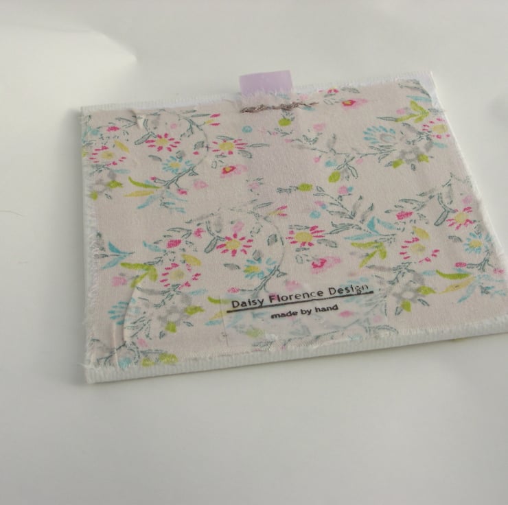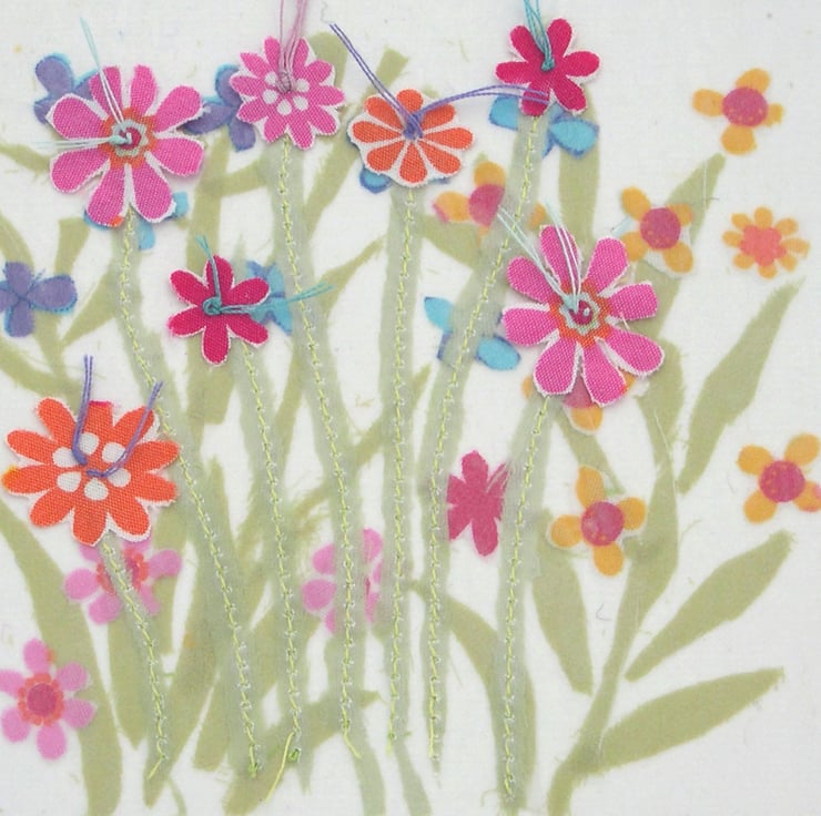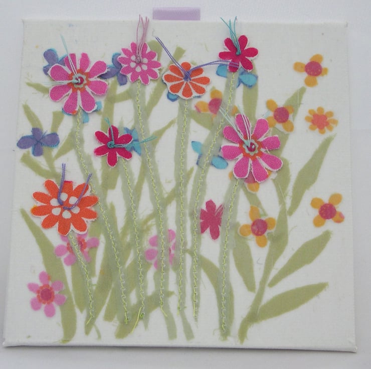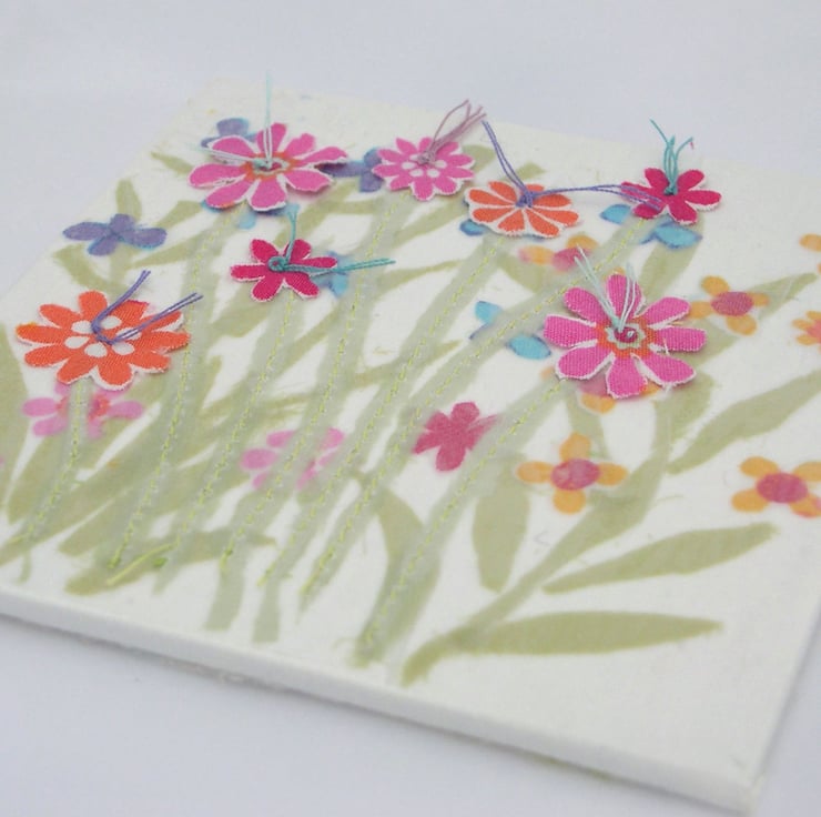 Individually hand crafted with recycled textiles and papers to create a delicate layered effect, embellished with stitch and hand cut flowers. The work is collaged and stitched onto a professional artists board and the back is covered in a floral fabric.