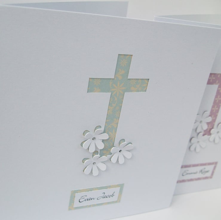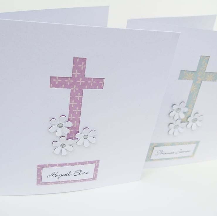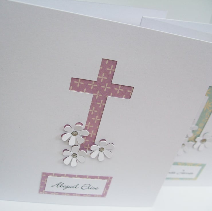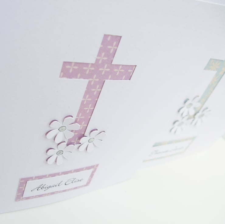 This beautiful and delicate Christening or Baptism card is perfect for a baby or child on their special day. The cross and little flowers have been hand cut to reveal pretty patterned card in a pinky purple colour or pale turquoise. The name of the child has been added to give it that personal touch.