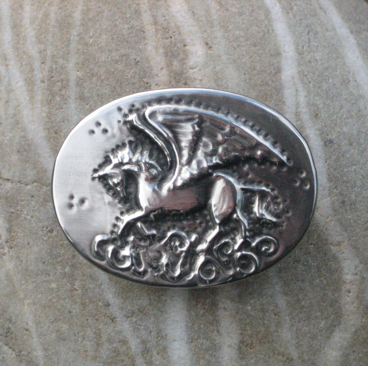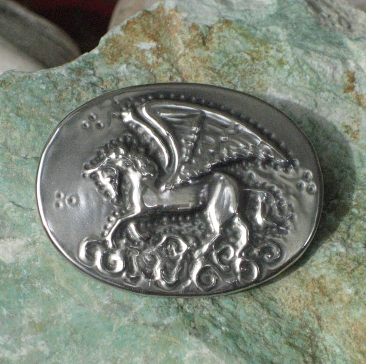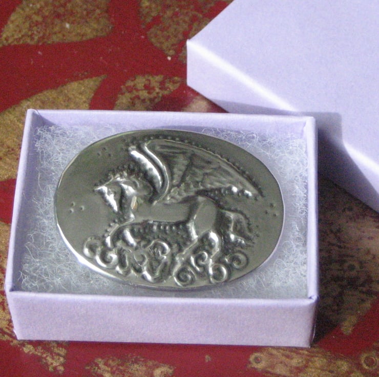 This striking brooch, depicting the mythical winged horse, has been hand crafted in shiny modern lead-free pewter. Measuring 44mm x 33mm, it has a 30mm pin with safety catch on the reverse.Comes in a gift box (may differ from that shown).