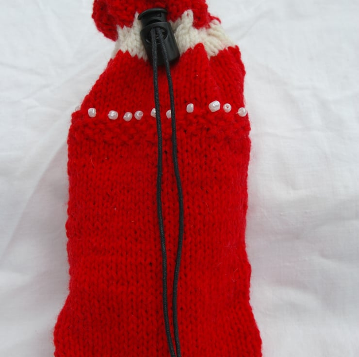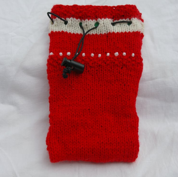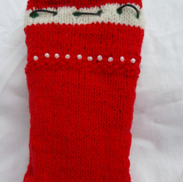 This little gift bag is hand knitted in red and white acrylic yarn. I have sewn a ring of individual, white china beads around the bag. It is lined in a glossy satin green material. The gift bag fastens with a length of black cord and a black spring toggle to keep your gift safe and secure inside. This little bag is just the thing to pop a little present into and place under the Christmas tree for someone special.