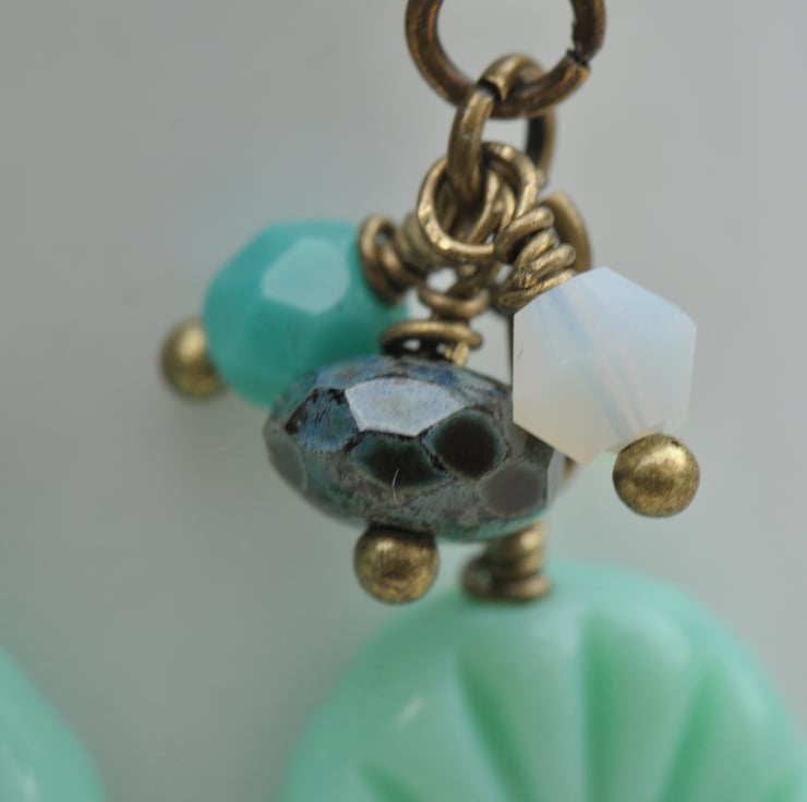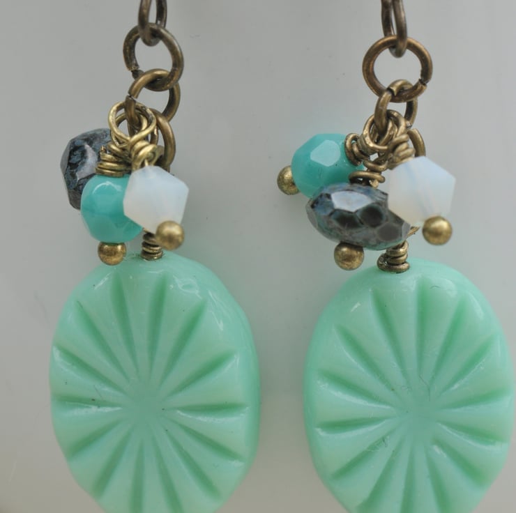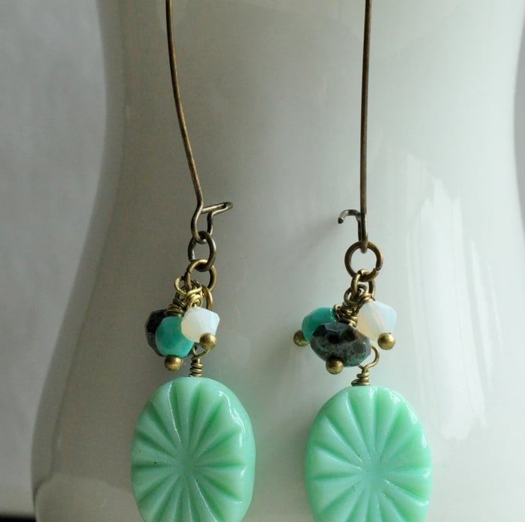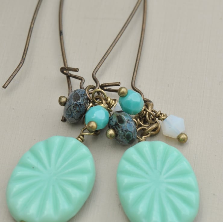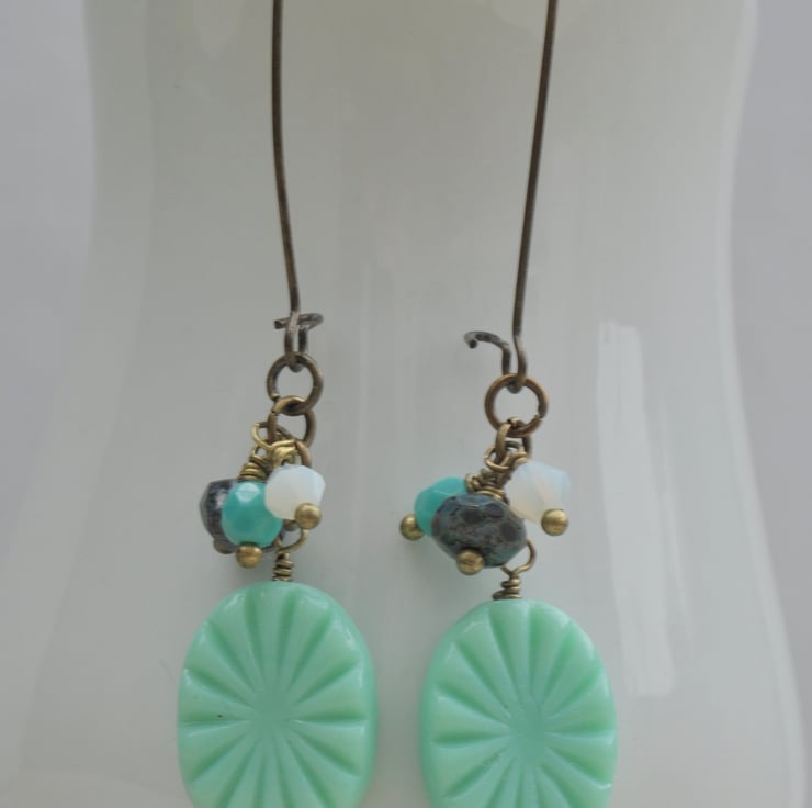 Lovely minty aqua Czech glass oval beads are the central focus on these earrings. I have added a little bouquet of a Czech Picasso finish rondelle bead, a little aqua firepolished Czech bead and a little opal bicone bead above and the earrings are finished on long style kidney earwires.