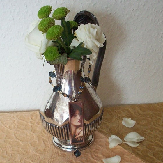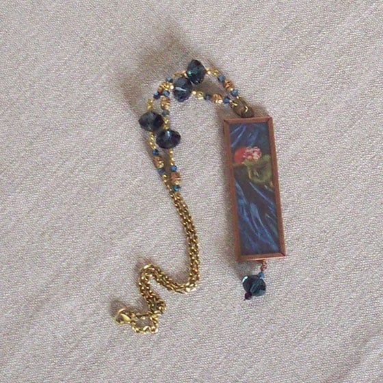One of a kind Art Necklace. Found image of artwork mounted under glass and framed in an antique copper frame. It is believed that it was during sittings for this portrait that Janey Morris and Rossetti became drawn to each other, possibly rekindling an attraction from 1857 when she was "discovered " by Rossetti in Oxford at the theatre. This discovery led to her modelling for Rossetti and William Morris and William Morris married her. The whole portrait shows her in an amazing teal-blue silk dress, no corset, the antithesis of Victorian buttoned up stiff costume. Lovely blue beads and figured brass beads complement the picture. Another image from the picture is on the reverse. Comes to you in a gift box. Please contact me for multiple or overseas postage as rates vary. Thanks for looking and for supporting hand-made!