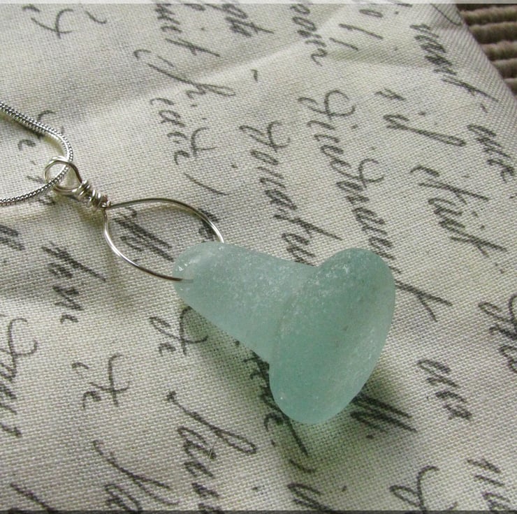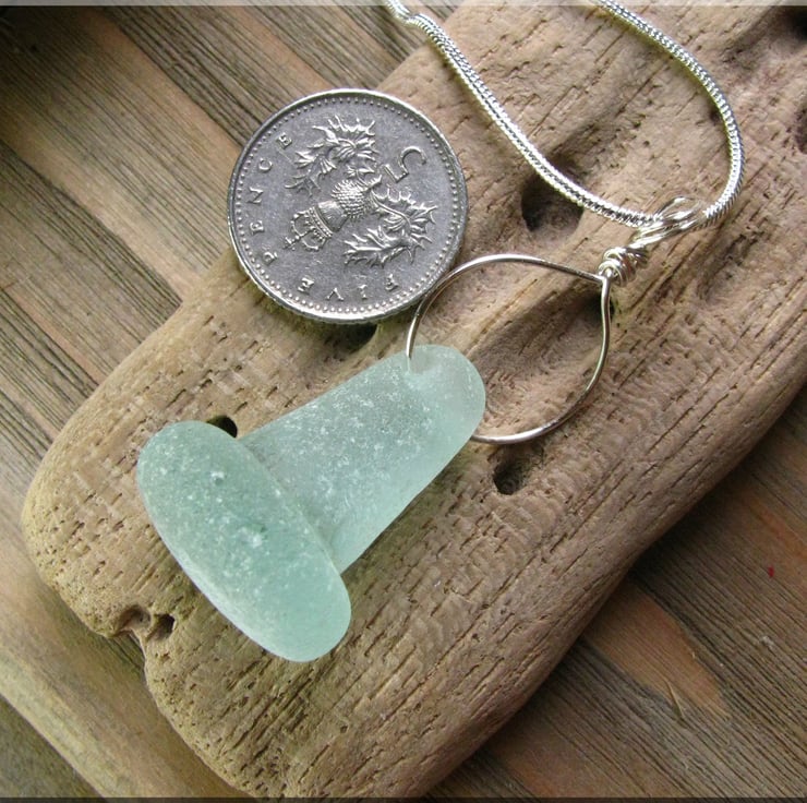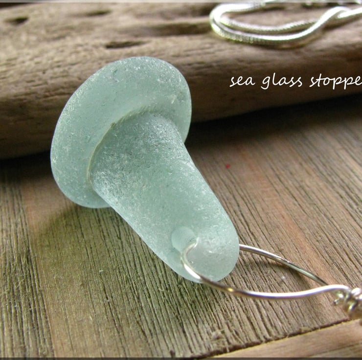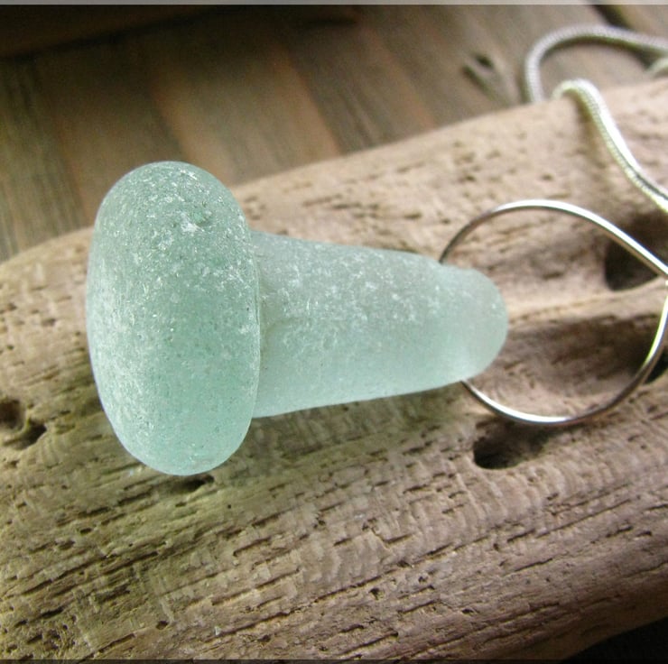 A beautifully frosted old sea glass bottle stopper in soft aqua, drilled through the tip and wired onto non tarnish wire. Suspended from an 18" silverplated snake chain.