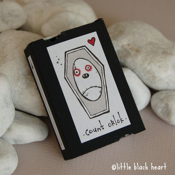 he is about 4cm tall, and lives in a black matchbox-coffin.
