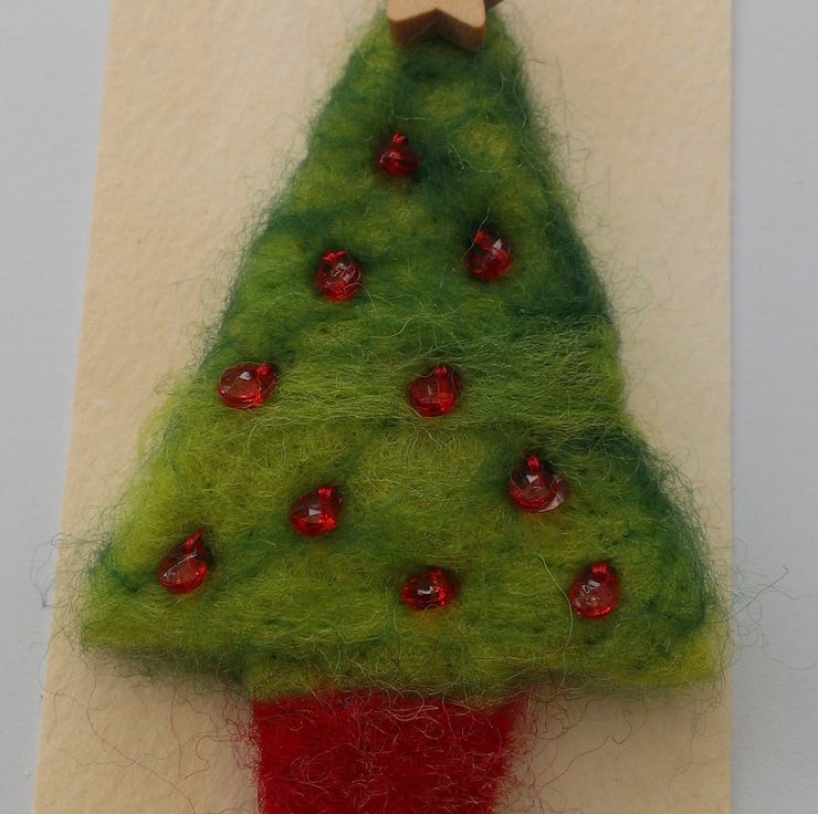 Handcrafted needle felted Christmas tree card. - 5x5 inches with scalloped edge and bead detail.