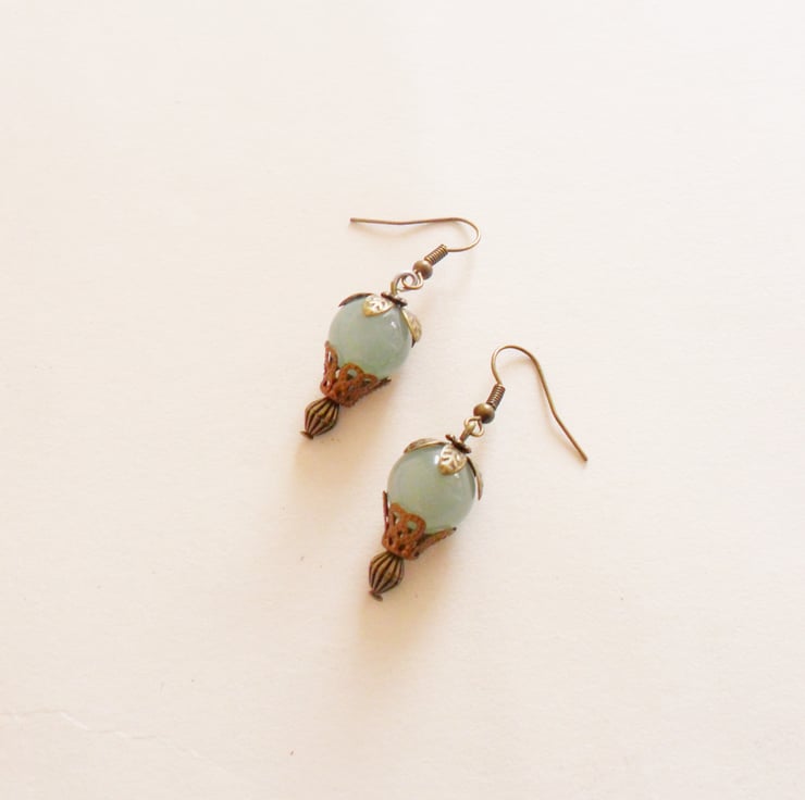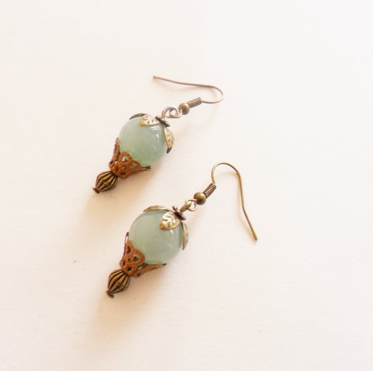 Beautiful Aventurine 10mm beads are paired with antiqued bronze beads and bead caps to make these Vintage style unusual hot air balloon earrings. They would also be a great addition to any outfit...... to wear on your Time Travels