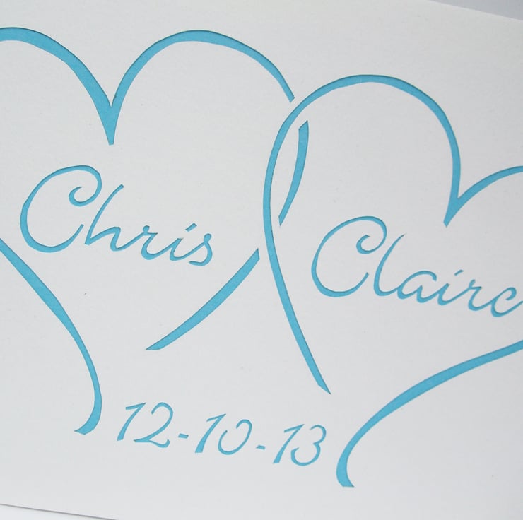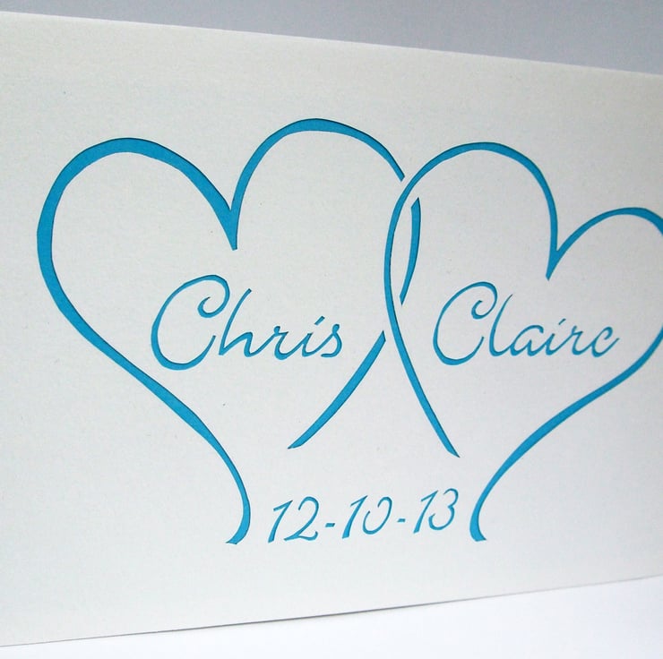 This beautiful card makes the perfect wedding card for the happy couple with their names hand cut within two entwined hearts. The date of the wedding has then been added beneath the hearts. A simple but very personal card for a very special occasion.