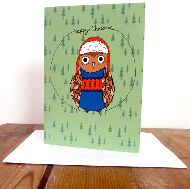 Featuring an owl wrapping up warm in a wooly hat and Christmas sweater!