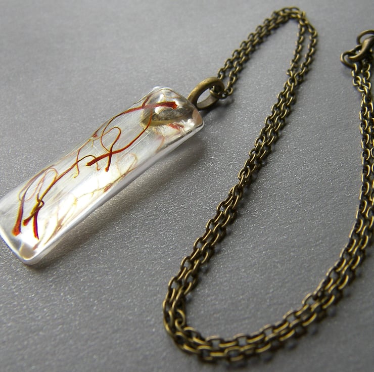 Description: This lovely spicy red saffron sealed in UV resistant non toxic eco resin, Pendant measures approx 50mm x 15mm, (approx 2" x just over 0.5")) hangs on a 18" vintaj look anitque gold plated chain ( lovely necklace, perfect gift for any chef or cook, or anyone who loves hanging out in the kitchen!!