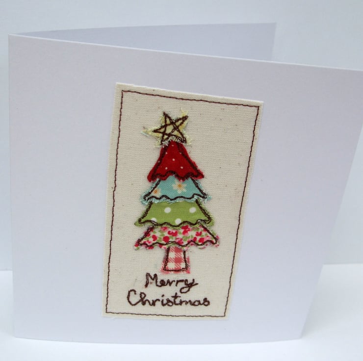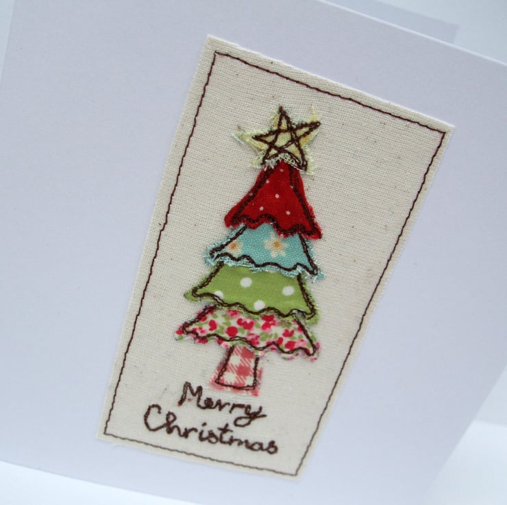 This little christmas tree has been machine embroidered onto the card using layers of different fabrics making a lovely handmade card to give to someone special at Christmas!