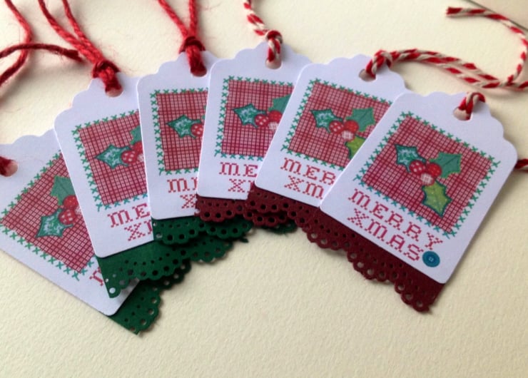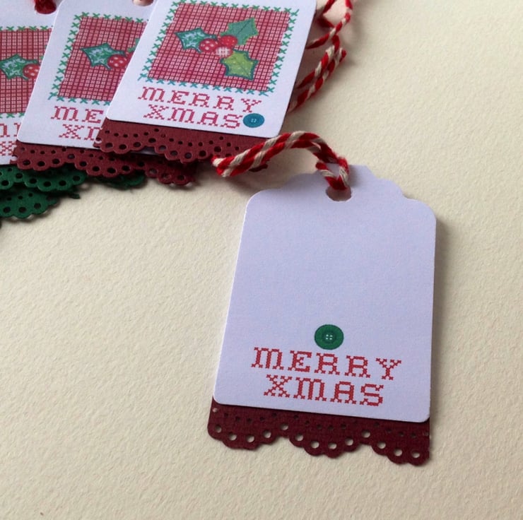 They are made of top quality white card with the xmas design on the front, this is a red and white check background square, with an applique image of holly and berries, surrounded in a printed cross stitch with 'Merry Xmas' also in a cross stitch text and with a small digital printed button.
