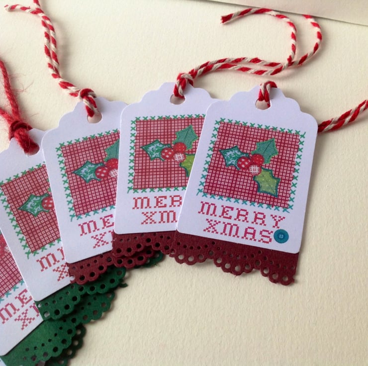 They are made of top quality white card with the xmas design on the front, this is a red and white check background square, with an applique image of holly and berries, surrounded in a printed cross stitch with 'Merry Xmas' also in a cross stitch text and with a small digital printed button.