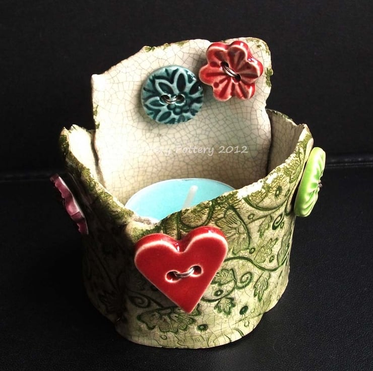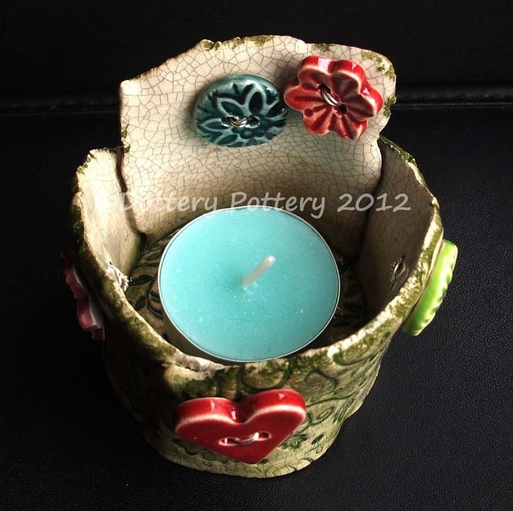 This cute little tea light holder is made from white earthenware clay.