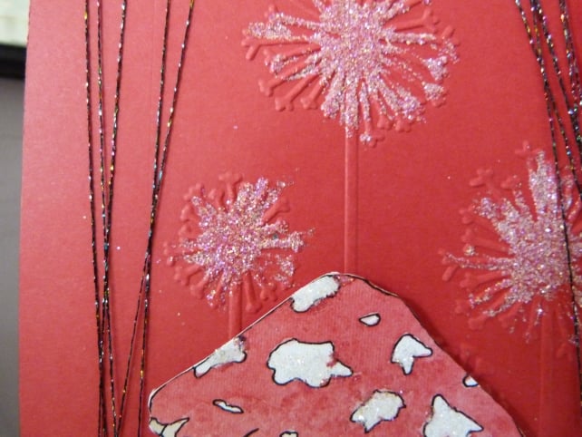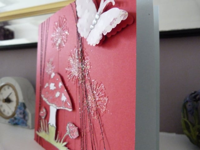 A truly handmade and individual designed card. A row of dandelions embossed onto quality red card, the dandelion heads embellished with fine silver glitter. A mushroom hand drawn and water colour painted and mounted on the red card. Finished off with a triple layered butterfly which has rhinestone body. Finished off with black glittered thread.