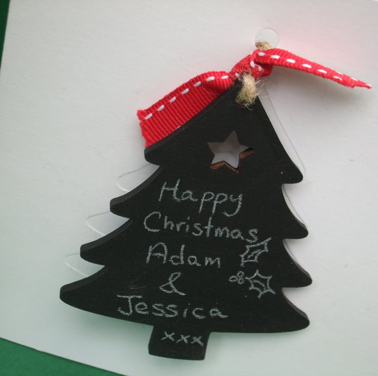 This is a card with a difference! The pretty wooden Christmas Tree shape has been painted with chalkboard paint, tied on a string with a ribbon and attached to a card, so you can send it as a card and gift in one. The christmas tree is easily removed from the card and hung on the tree and the tree shape has been embossed onto the card so it can still be put on display. If you wish, you can add a personal message on the tree in chalk, coloured pencils or permanent gold or silver pens.