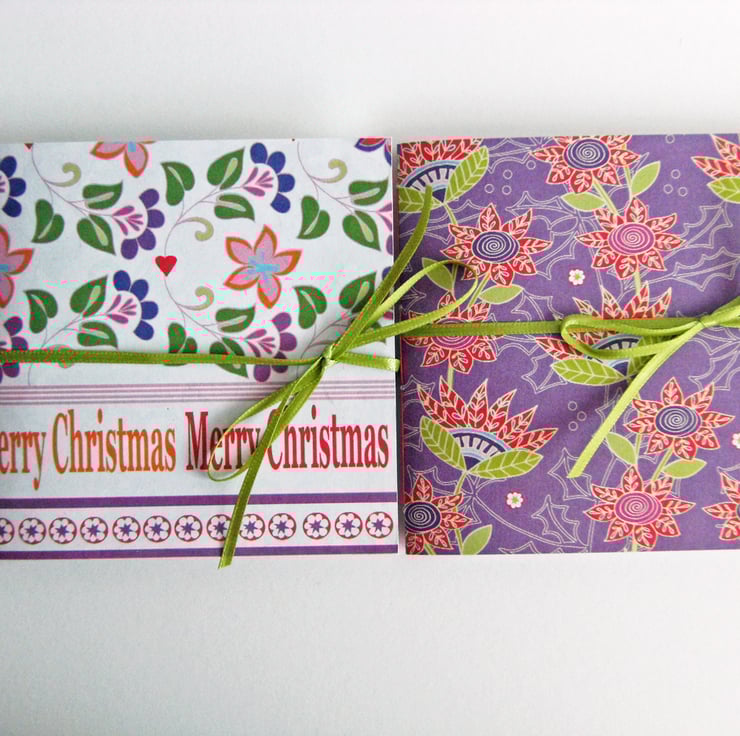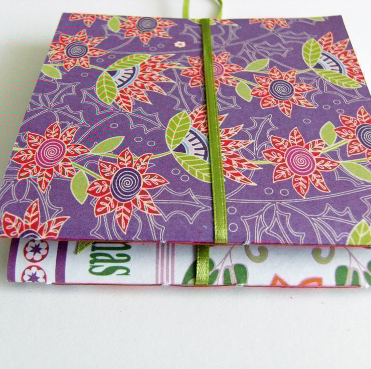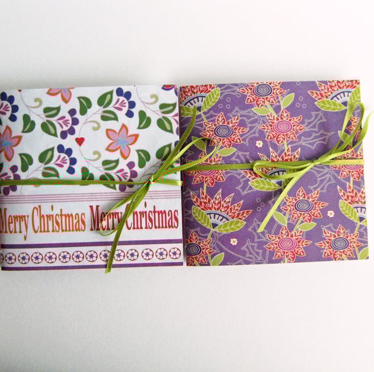 A pair of small square pocket notebooks, in cheerful seasonal designs, tied with contrasting green ribbons.