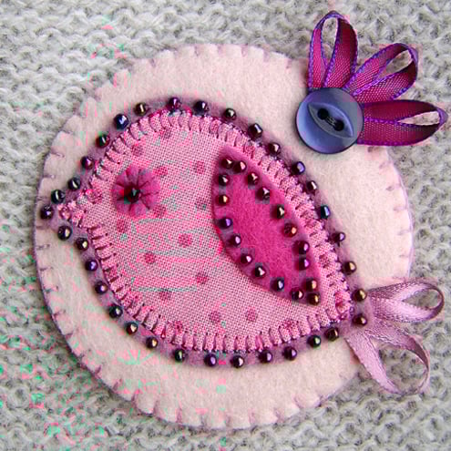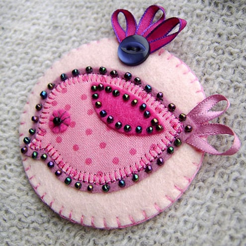This is a lovely handmade fabric brooch. It features a little bird in pink polka dot fabric appliqued onto a felt base. Completed with beaded eye, fuchsia felt wing, ribbon tail and edged with pretty coordinating beads. It is mounted onto a circular pale pink felt base and is finished with a pretty button and ribbon detail. It has a brooch backing for easy attachment.