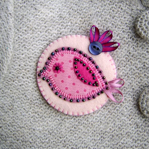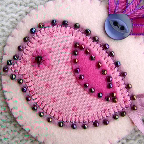 This is a lovely handmade fabric brooch. It features a little bird in pink polka dot fabric appliqued onto a felt base. Completed with beaded eye, fuchsia felt wing, ribbon tail and edged with pretty coordinating beads. It is mounted onto a circular pale pink felt base and is finished with a pretty button and ribbon detail. It has a brooch backing for easy attachment.