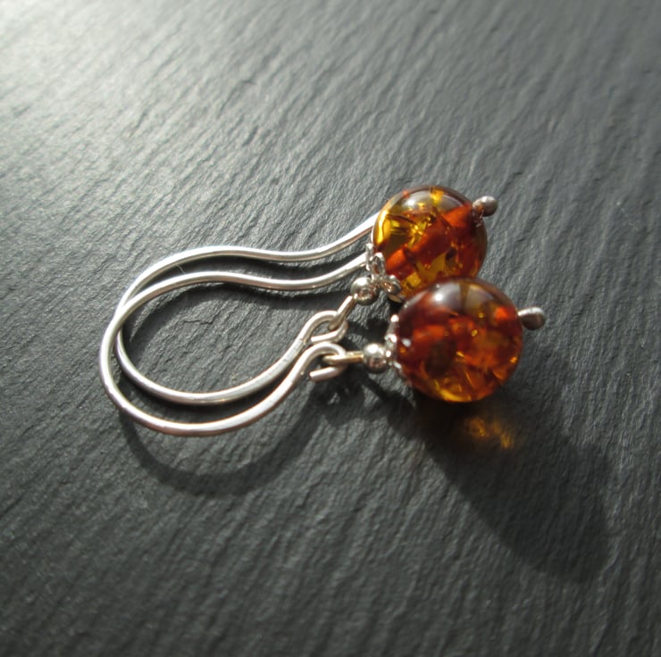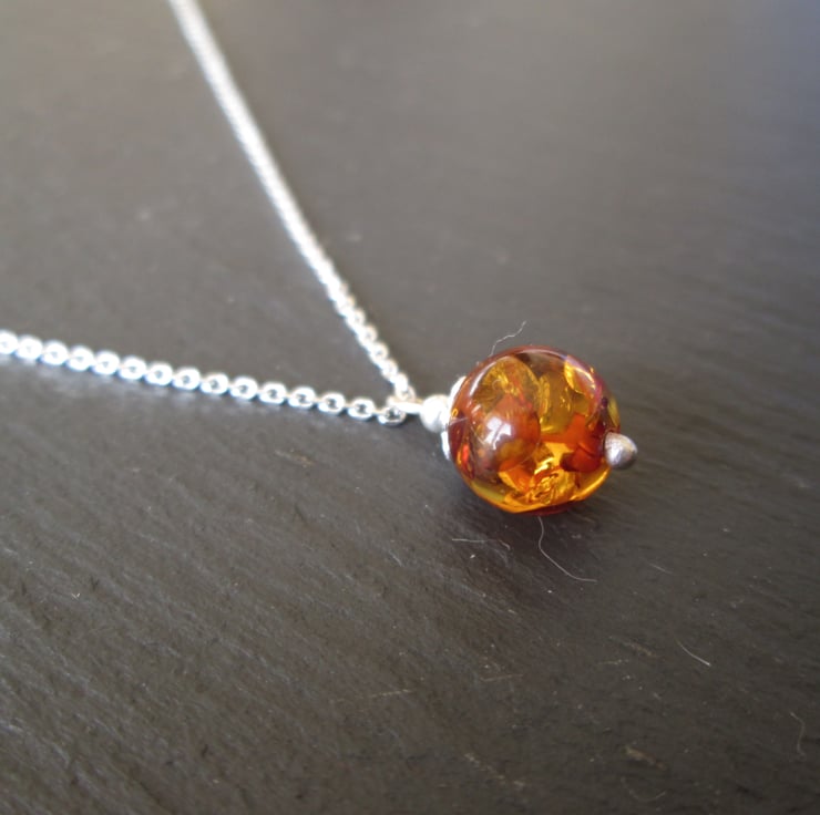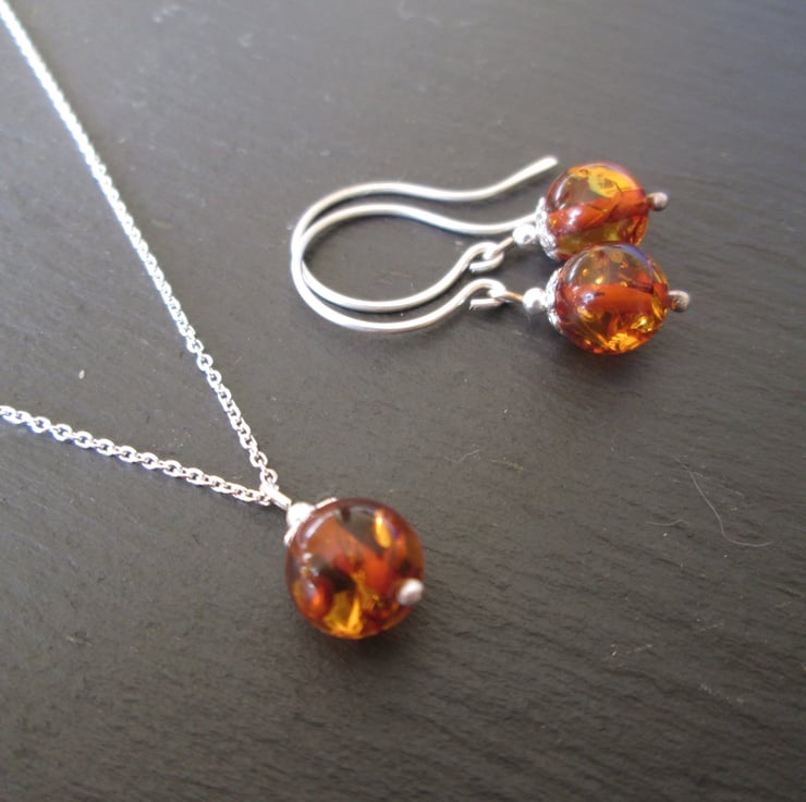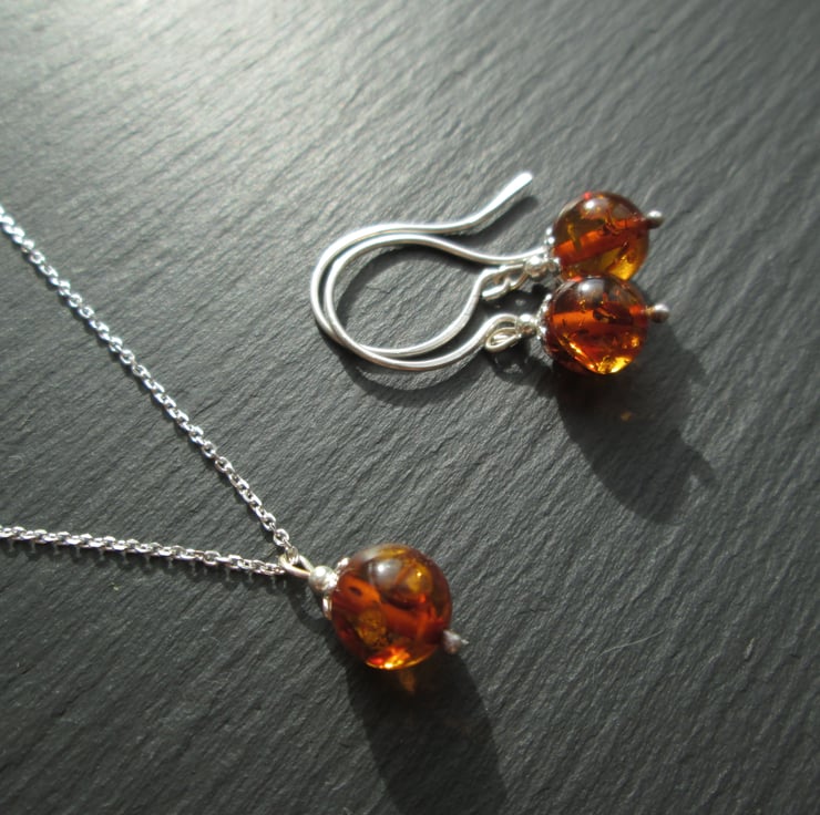 A simple yet elegant jewellery set featuring three beautiful natural amber beads (8mm). Two have been hung from handcrafted sterling silver ear wires and the third from a sterling silver (925) chain in your choice of 16 or 18” (please state preference upon purchase).