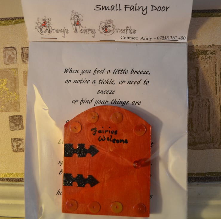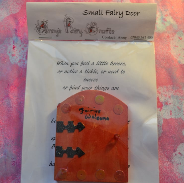 Painted and decorated wooden fairy door. These little doors look lovely placed against a skirting board, bookcase or just against the wall, just use a little double sided tape. They should not be placed outside. Fairy doors bring a touch of magic to the home and encourage the little folk to visit and open the portal between their world and ours. This item is approximately 7 cm (2.75 inches) wide and 8 cm (3.15 inches) high.