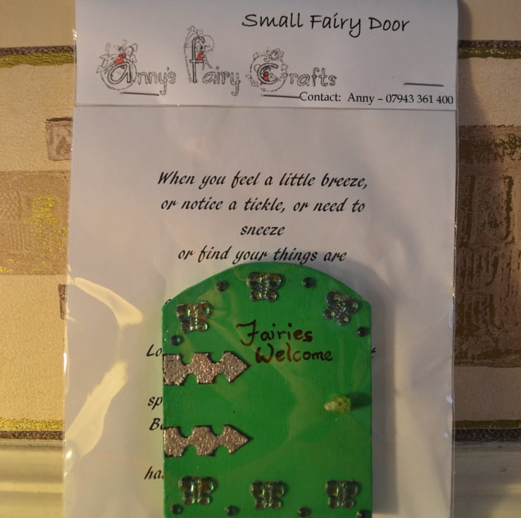 Painted and decorated wooden fairy door. These little doors look lovely placed against a skirting board, bookcase or just against the wall, just use a little double sided tape. They should not be placed outside. Fairy doors bring a touch of magic to the home and encourage the little folk to visit and open the portal between their world and ours. This item is approximately 7 cm (2.75 inches) wide and 8 cm (3.15 inches) high.