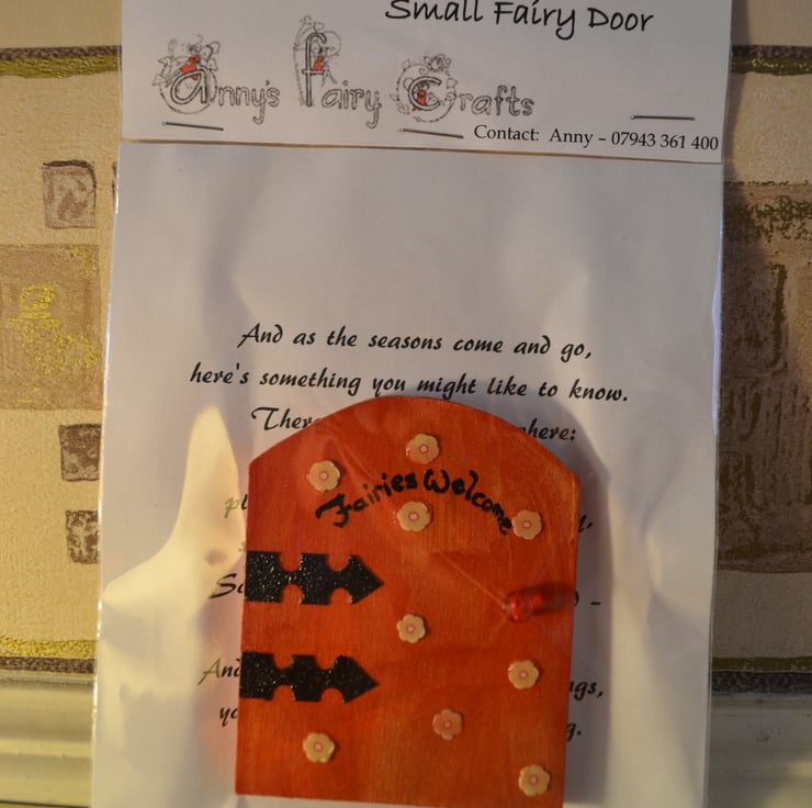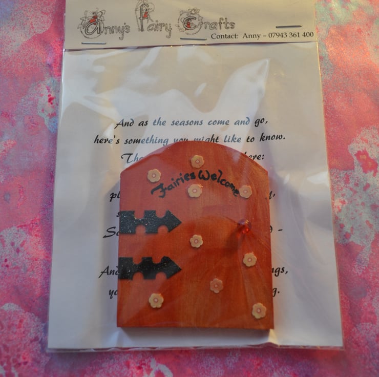 Painted and decorated wooden fairy door. These little doors look lovely placed against a skirting board, bookcase or just against the wall, just use a little double sided tape. They should not be placed outside. Fairy doors bring a touch of magic to the home and encourage the little folk to visit and open the portal between their world and ours. This item is approximately 7 cm (2.75 inches) wide and 8 cm (3.15 inches) high.