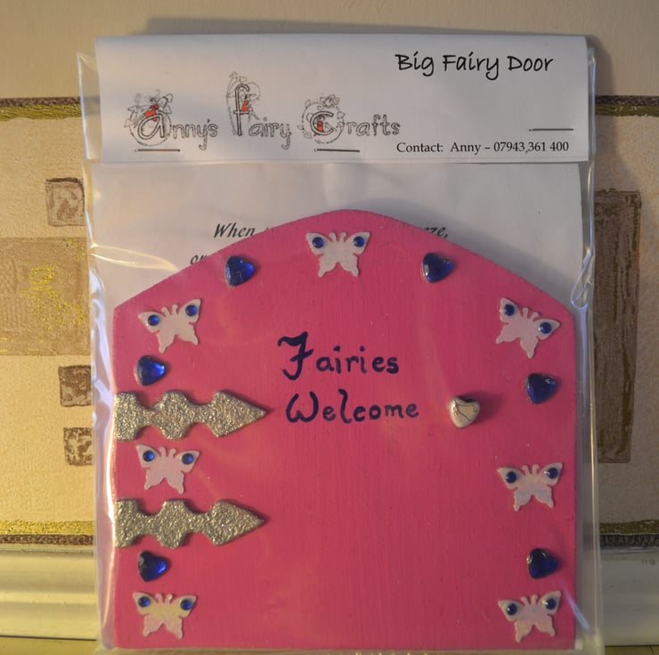 Painted and decorated wooden fairy door. These doors look lovely placed against a skirting board, bookcase or just against the wall, just use a little double sided tape. They should not be placed outside. Fairy doors bring a touch of magic to the home and encourage the little folk to visit and open the portal between their world and ours. This item is approximately 12.5 cm (5 inches) wide and 12 cm (4.75 inches) high.