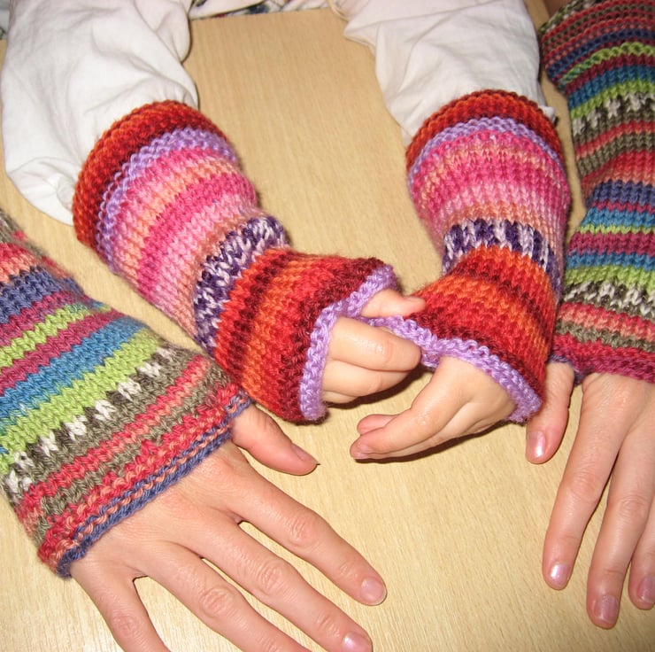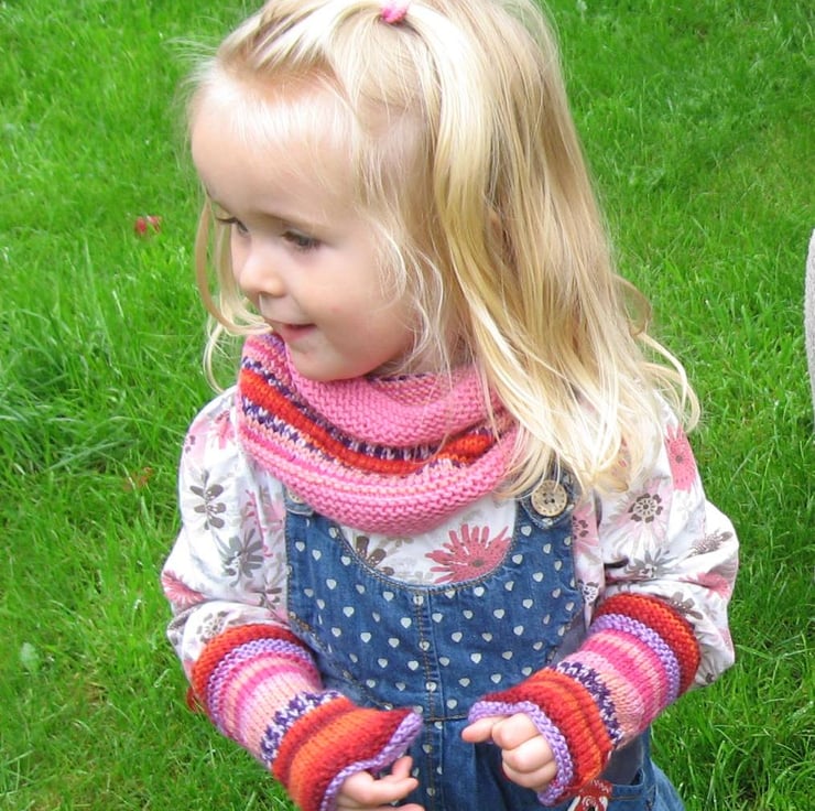 Really easy knitting pattern for fingerless gloves/arm warmers and cowl. Can be knitted in double knitting self-striping yarn. The yarn shown is Adriafil Knitcol (100% superwash merino wool) which comes in the most beautiful range of colours.