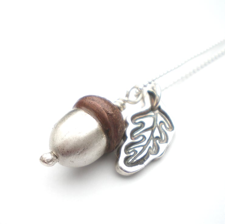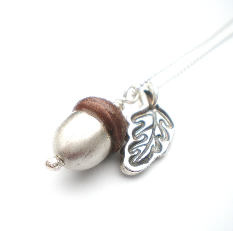 The pretty acorn necklace also features a small silver leaf oak leaf charm.