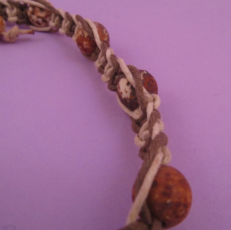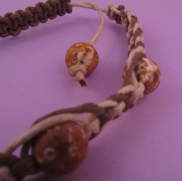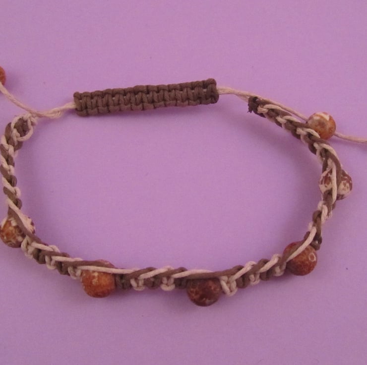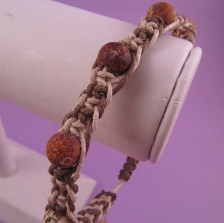 This is a stunning unisex brown jasper and cream hemp macramé bracelet. It is created using real jasper gemstones, brown hemp cord, and cream hemp cord. This has a very natural look and would suit either men or women. The bracelet design measures 7 and a half inches (19 cm) and expands to 10 and a half inches (26.6 cm). The beads are 0.8 cm in diameter, the bracelet is approx. 1 cm wide.