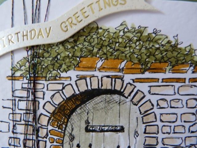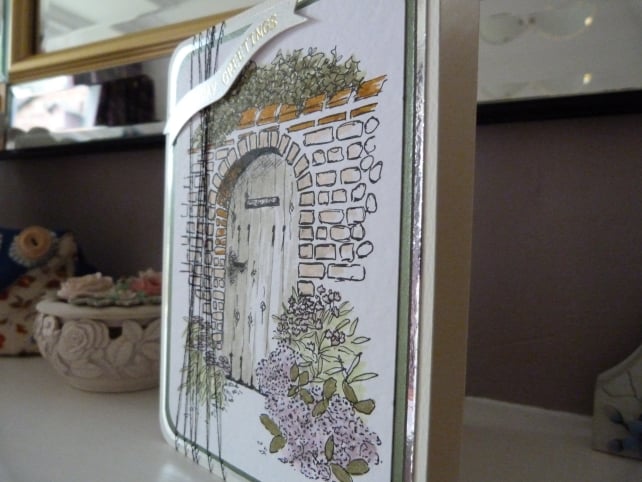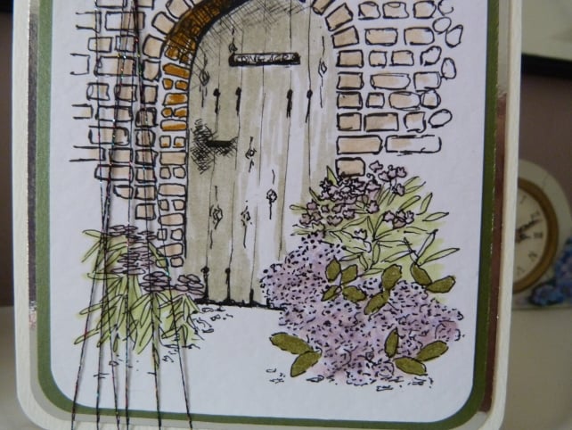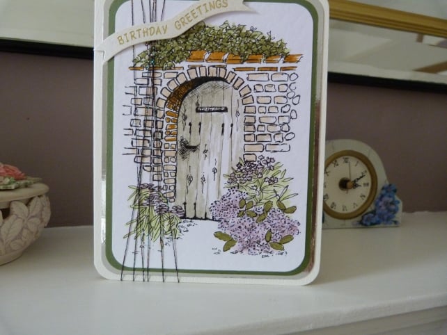 A unique completely hand made card. A secret garden door drawn in pen and ink and water colour painted on quality white card. Mounted onto sage green pearl card then onto quality cream textured card. Finished off with birthday greetings tag and black glittered thread.