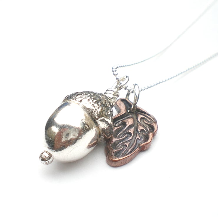 Made from recycled fine silver and copper. The acorn is hung on your choice of a 16 inch (40cm) 0r 18 inch (45cm) sterling silver ball style chain.