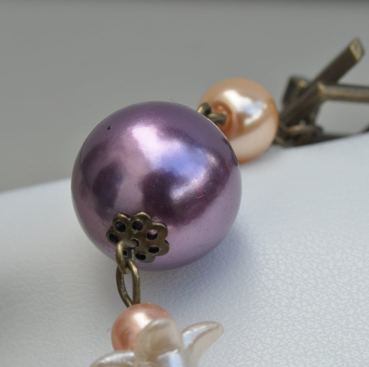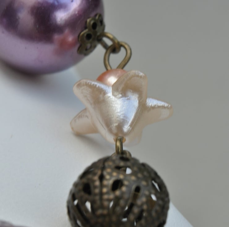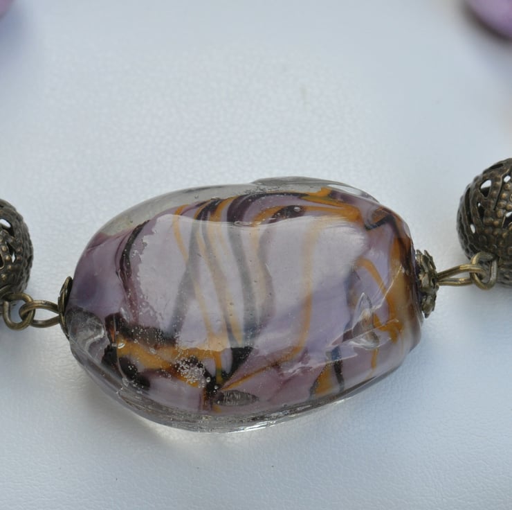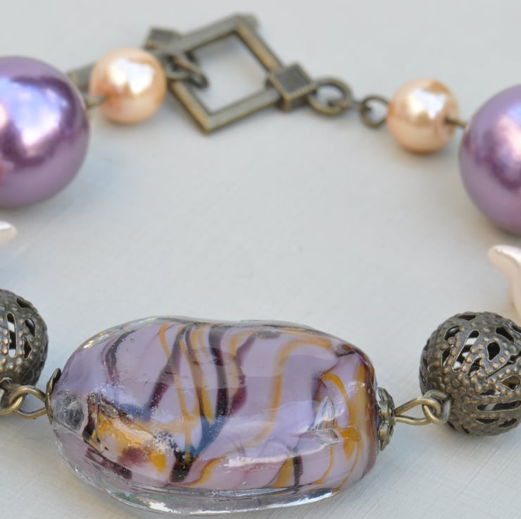 A lovely swirl glass bead is the focal for this bracelet which features antique bronze plated filigree beads, peach flower beads, large purple acrylic pearls and peach glass pearls finished with an antique bronze plated toggle clasp.