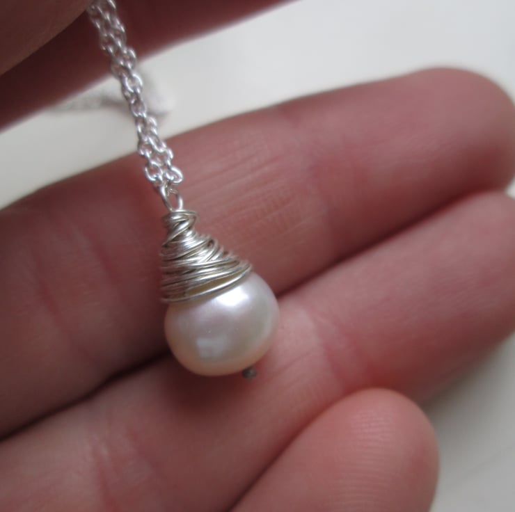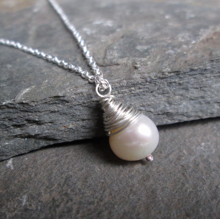 Pearl necklace featuring a single ivory freshwater pearl (8mm) hand wrapped in sterling silver wire. The classic droplet shape has timeless appeal and is popular for weddings and occasion wear, whilst its simple design makes it a wearable piece to enjoy everyday.