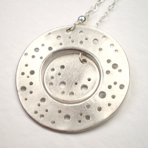 The large pendant measures 3.5cm in diameter and the small disc is 2cm in diameter. The small disc slips perfectly trough the larger pendant and can be hung loose on it's sterling silver chain for a long lariat, or wound through the pendant to create a shorter, choker style. Both the pendant and disc have a brushed silver finish for a soft sheen.