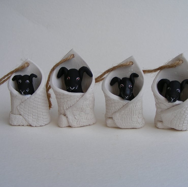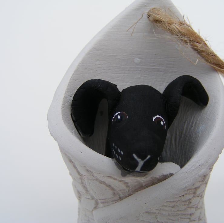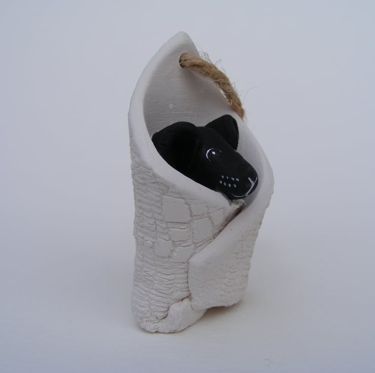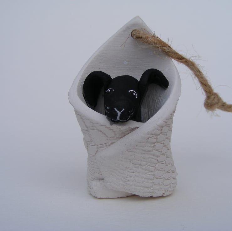 This is a tiny dog wrapped up in a blanket, it measures 6cm by 3.5cm. I modelled the dog first out of semi-porcelain clay. then rolled some clay out and used lace to impress a pattern, I then wrapped this around the dog. I drilled a hole in the top and threaded string through so it can be hung up, it also stands up alone. After firing I painted the dog with acrylic paint.