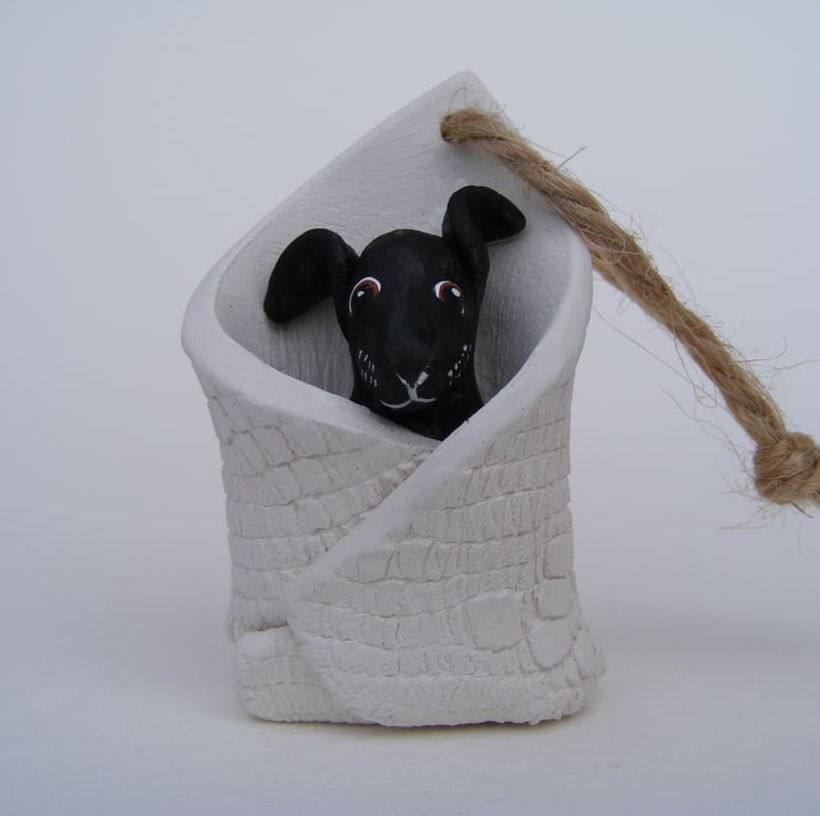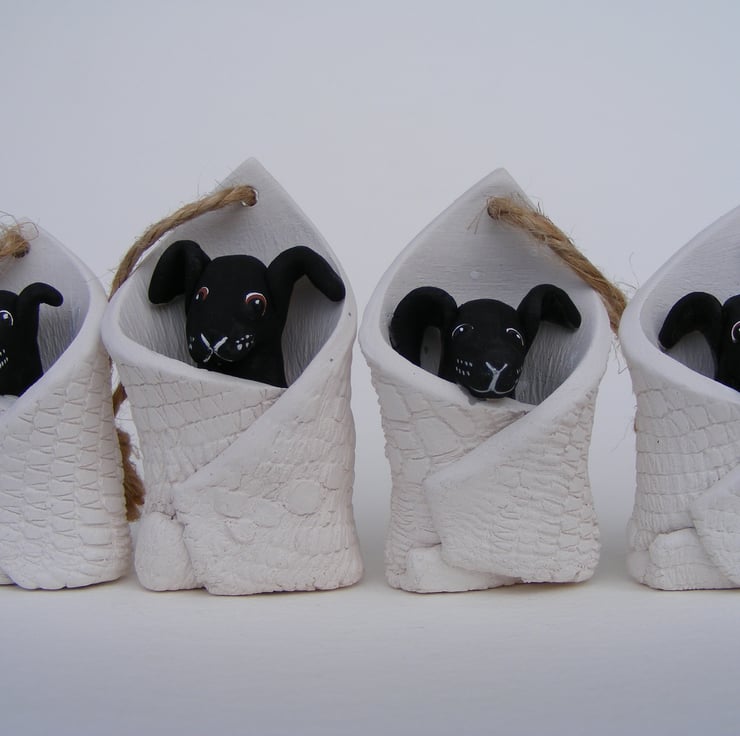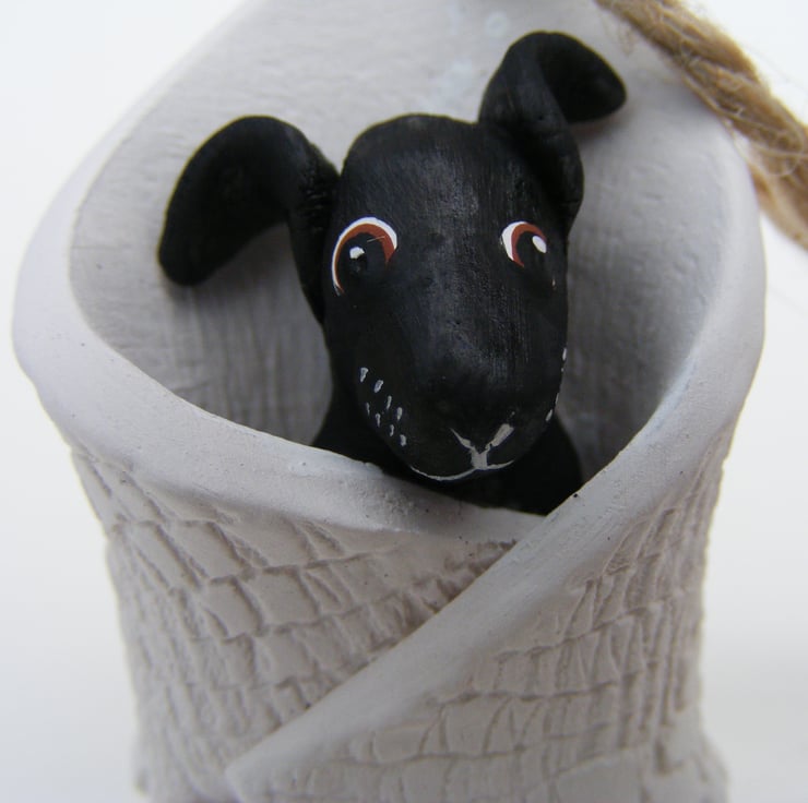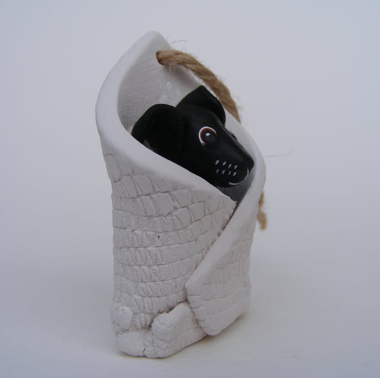 This is a tiny dog wrapped up in a blanket, it measures 5.5cm by 3.5cm. I modelled the dog first out of semi-porcelain clay. then rolled some clay out and used lace to impress a pattern, I then wrapped this around the dog. I drilled a hole in the top and threaded string through so it can be hung up, it also stands up alone. After firing I painted the dog with acrylic paint.