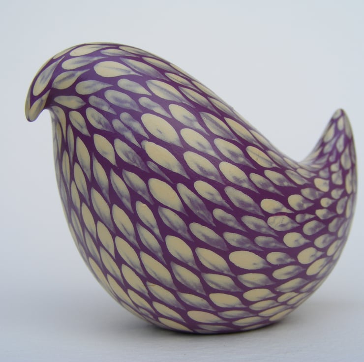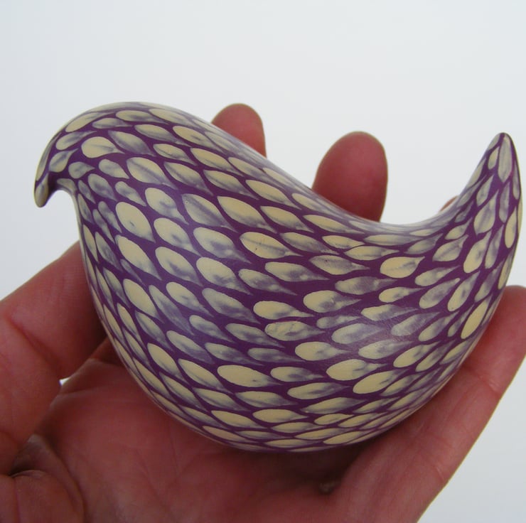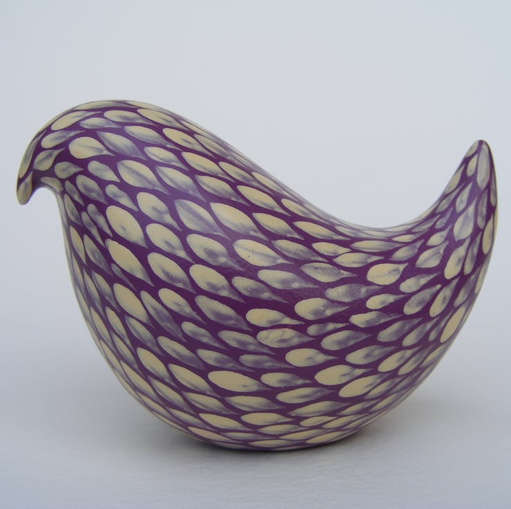 This little bird measures, 9 cm long and 6 cm high. I modelled the shape of the bird first then made a mould, then cast with semi-porcelain slip and fire to 1100 degrees centigrade. Using acrylic paint I decorate the bird, first with lilac then I add individual feather marks in cream, each one is a single brush stroke. I then varnish to protect the decor.