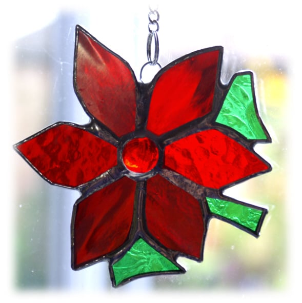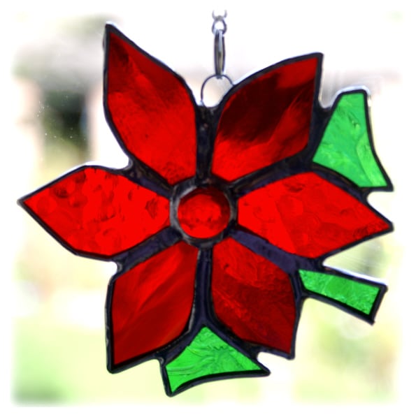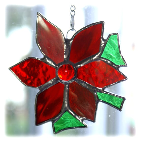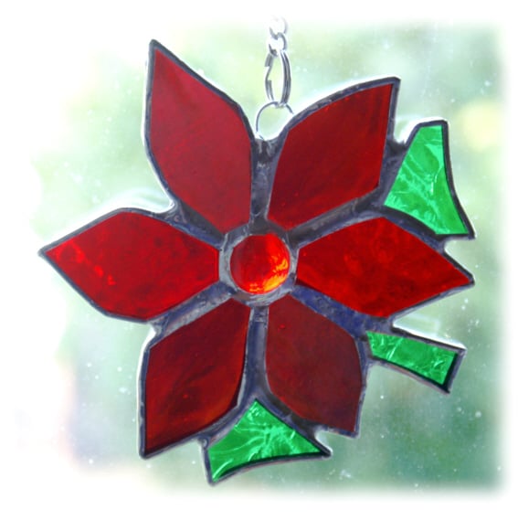 It is a gorgeous bright red Poinsettia made of three different types of lovely iridescent and textured red glass with green for the leaves and a super bright red nugget for the centre.