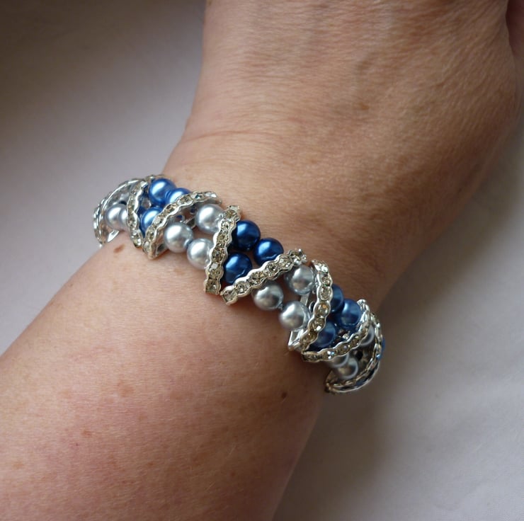 THE BRACELET HAS BEEN MADE WITH 6MM GLASS PEARLS IN SHADES OF RICH DEEP BLUE, ROYAL BLUE AND SILVER GREY ALONG WITH HALF MOON DESIGNED RHINESTONE SPACERS AND FINISHED WITH SILVER PLATED LOBSTER CLASP AND FINDINGS.