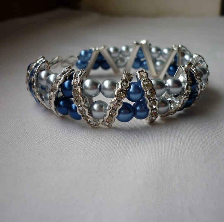 THE BRACELET HAS BEEN MADE WITH 6MM GLASS PEARLS IN SHADES OF RICH DEEP BLUE, ROYAL BLUE AND SILVER GREY ALONG WITH HALF MOON DESIGNED RHINESTONE SPACERS AND FINISHED WITH SILVER PLATED LOBSTER CLASP AND FINDINGS.