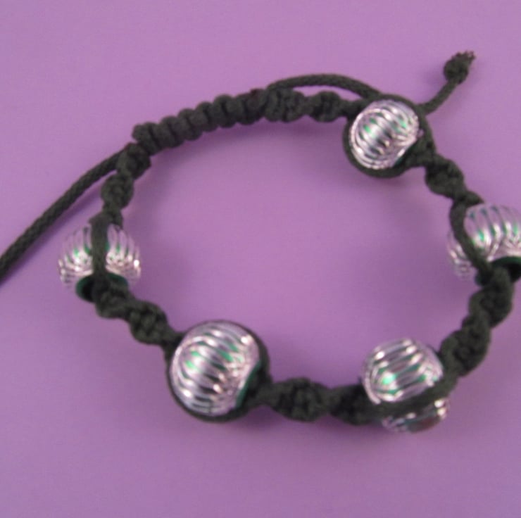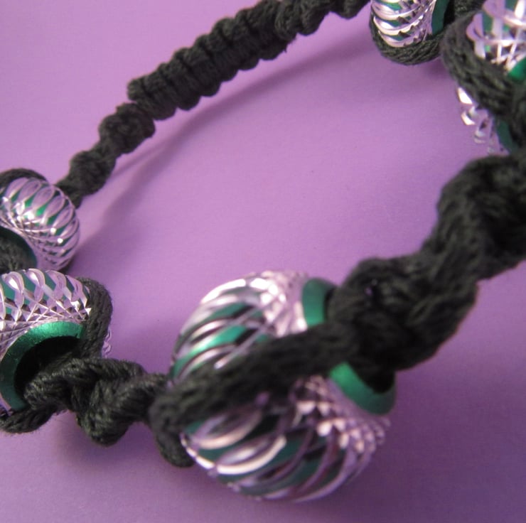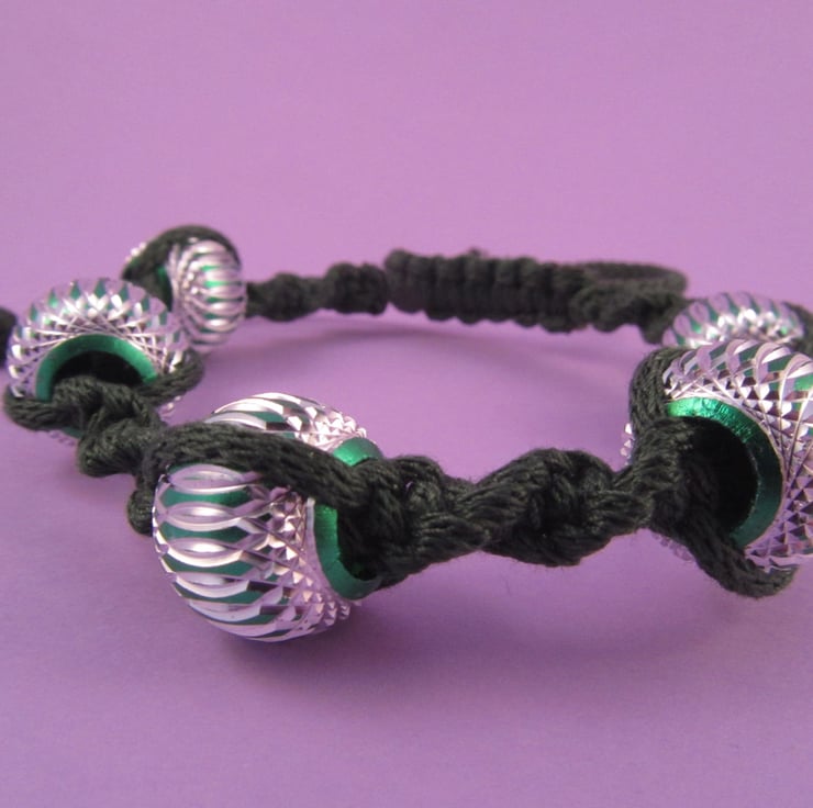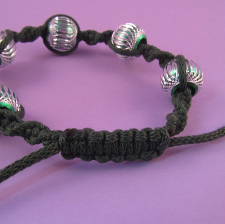 This is a pretty dark green twist macramé bracelet with green and silver colour aluminium beads. It is created using dark green cotton cord and shiny aluminium beads. This would be great for everyday wear.