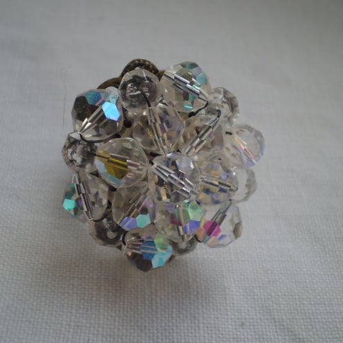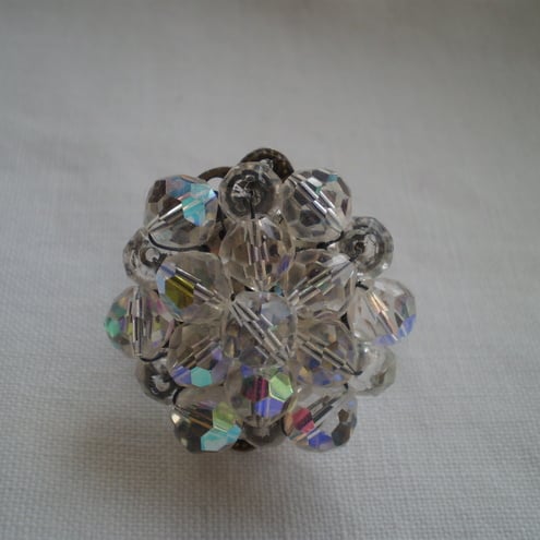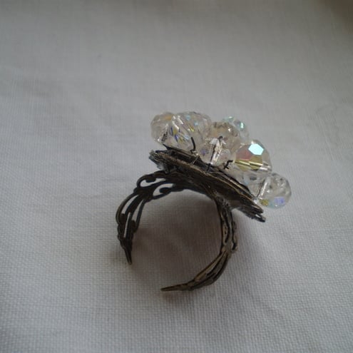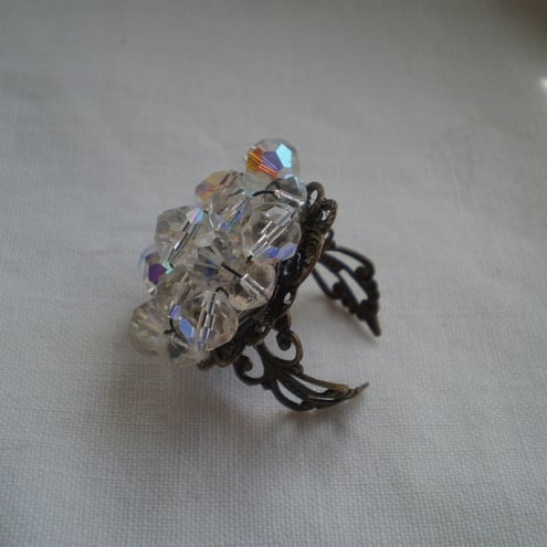 Steampunk at it's best... recycling a 1950's beautiful Aurora Borealis crystal earring into a very on trend big ring. I have used a antiqued finding and adjustable filigree ring to create this very eye catching piece of jewellery..... create sparkle wherever you go.