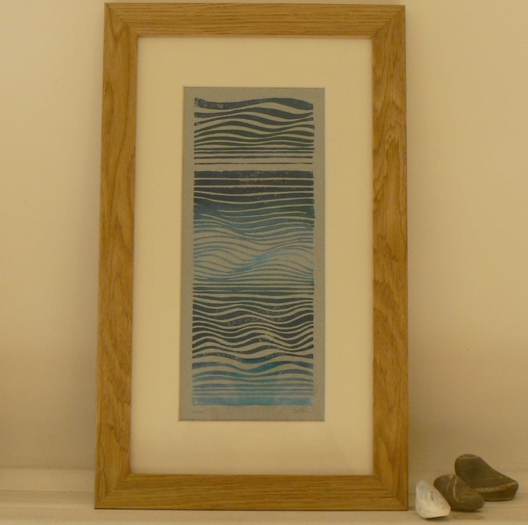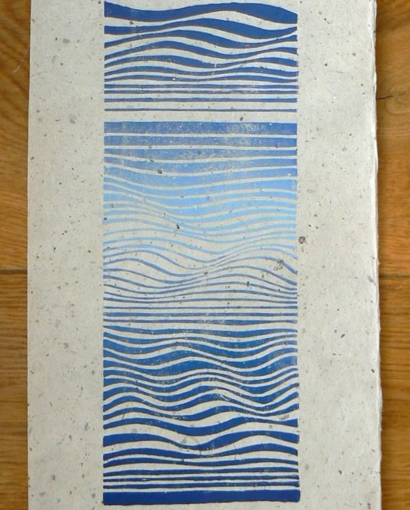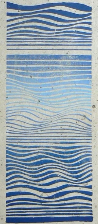 The lino cut is printed in a blend of inks in shades of blue, and is hand printed onto handmade lokta paper. The image measures 12 x 28 cm. Every print will be slightly different.