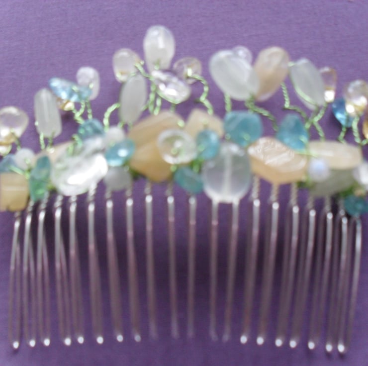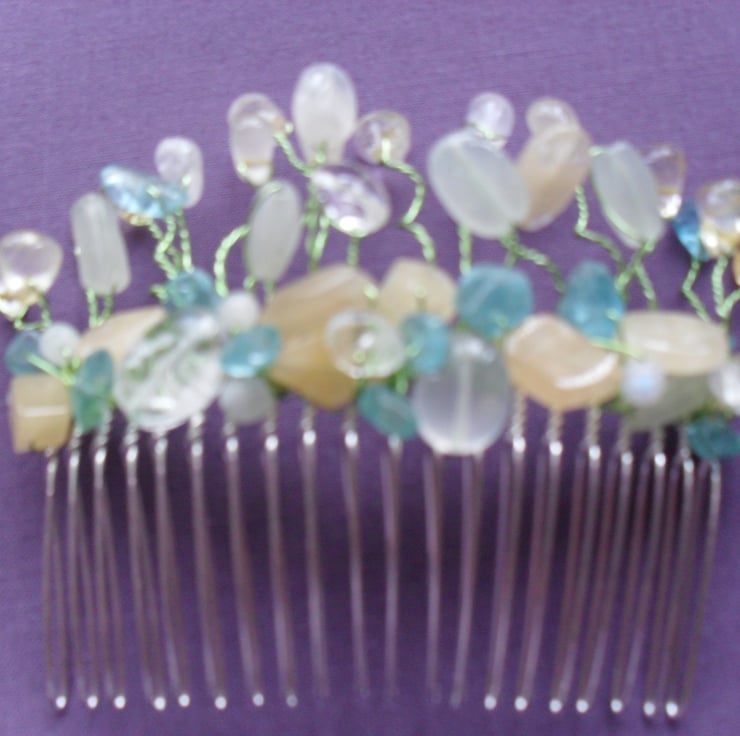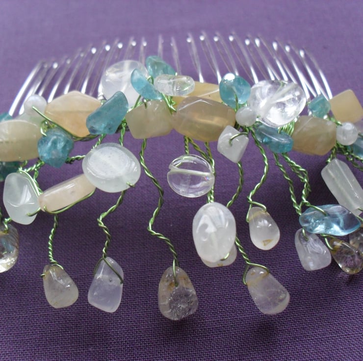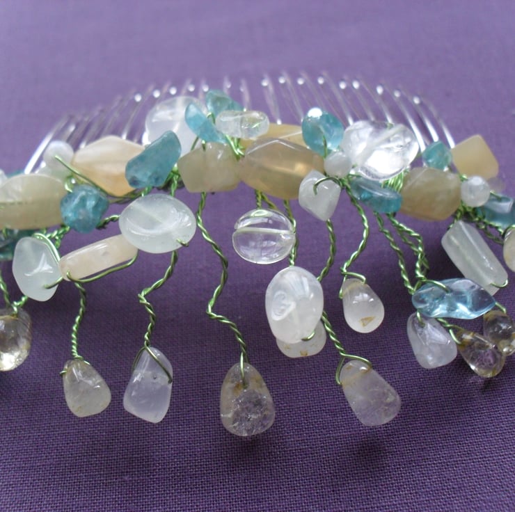 SALE was £15 now £8 Semi precious gemstones of apatite,quartz, citrine , peach and pale green coloured aventurine are attached to a gold tone hair comb with a pale green wire