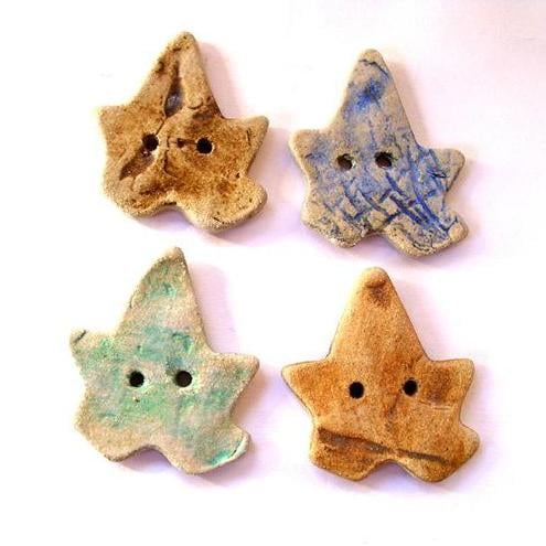 This set of 4 handmade ceramic buttons are a mixture of brown, blue & green colours with a textured pattern on the surface. Each leaf shaped button is approx 3cm wide.