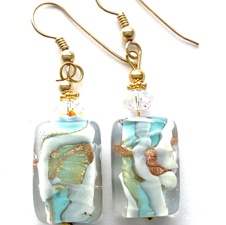 Murano glass earrings with rectangular Murano glass beads (20 x 14mm) with 24k gold foiled green and white rectangular Murano glass bead and a sparkly Swarovski crystal rondelle bead. These beads are really beautiful with swirls of gold, green and white and are enhanced by vermeil and gold filled spacers and round beads. The earrings hang from 14k gold filled gold ear wires and measure 30mm in length excluding wires.