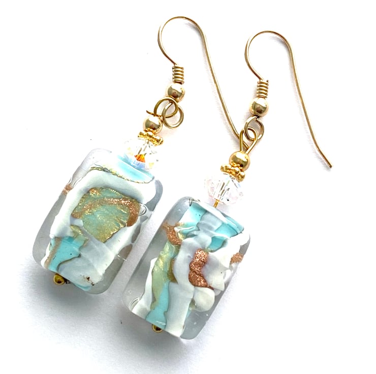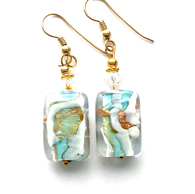 Murano glass earrings with rectangular Murano glass beads (20 x 14mm) with 24k gold foiled green and white rectangular Murano glass bead and a sparkly Swarovski crystal rondelle bead. These beads are really beautiful with swirls of gold, green and white and are enhanced by vermeil and gold filled spacers and round beads. The earrings hang from 14k gold filled gold ear wires and measure 30mm in length excluding wires.