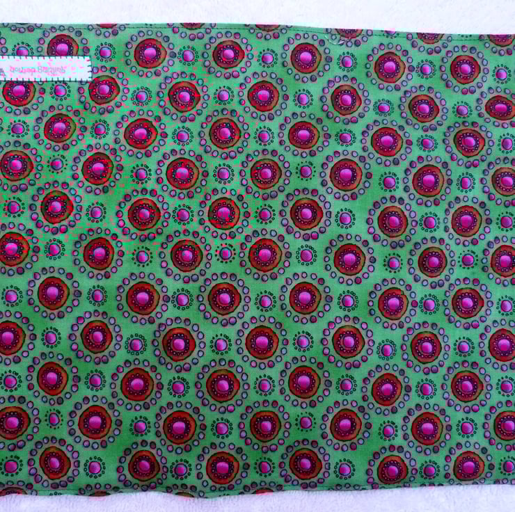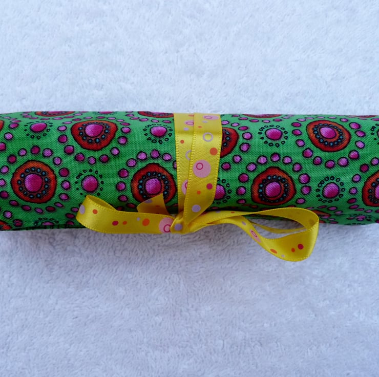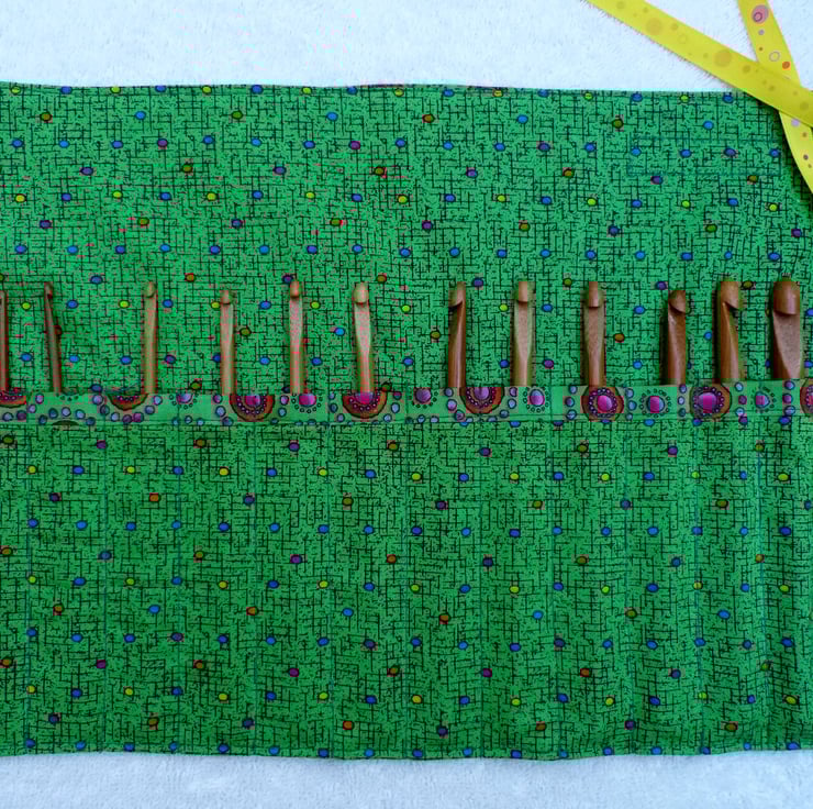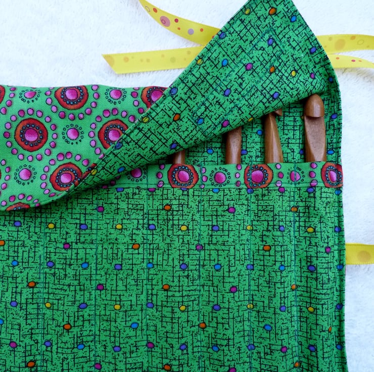 I have used a 100% cotton fabric to create this fantastic crochet hook case. It is sewn from a green print fabric with a matching green cotton lining and has a yellow dot design ribbon tie.